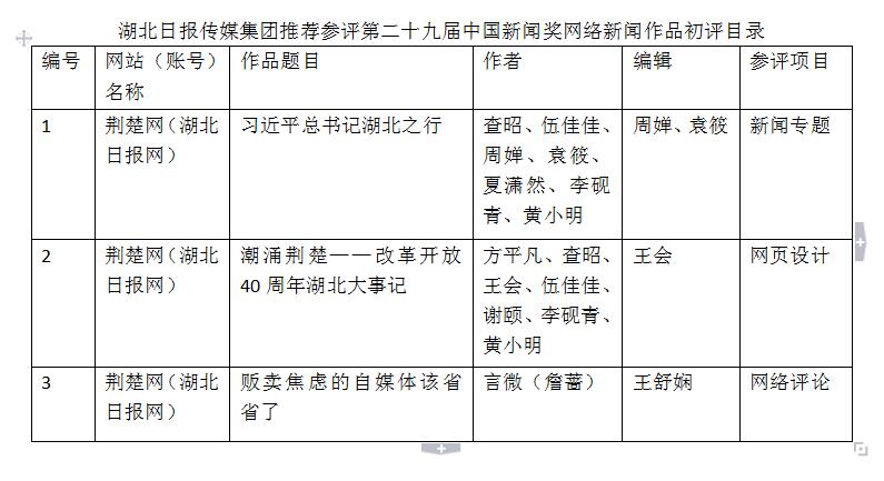 按照《中國新聞獎評選辦法》和《關于第二十九屆中國新聞獎報送工作的通知》要求,我單位通過內網公開發布通知,請各部門從2018年優秀新聞作品中推薦參評作品。各部門由領導班子成員及記者編輯組成評委會集體審議,提出本部門擬推薦中國新聞獎網絡新聞及媒體融合獎作品初評的候選作品。我單位組成評委會,對各部門推薦候選作品進行審議,以無記名投票方式選出6篇參評作品,現將推薦作品目錄予以公示,公示期從3月23日至3月27日。