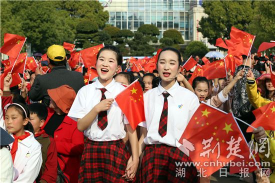 揮動的五星紅旗將七星廣場繪成紅色的海洋。(枝江市新聞中心 供圖)