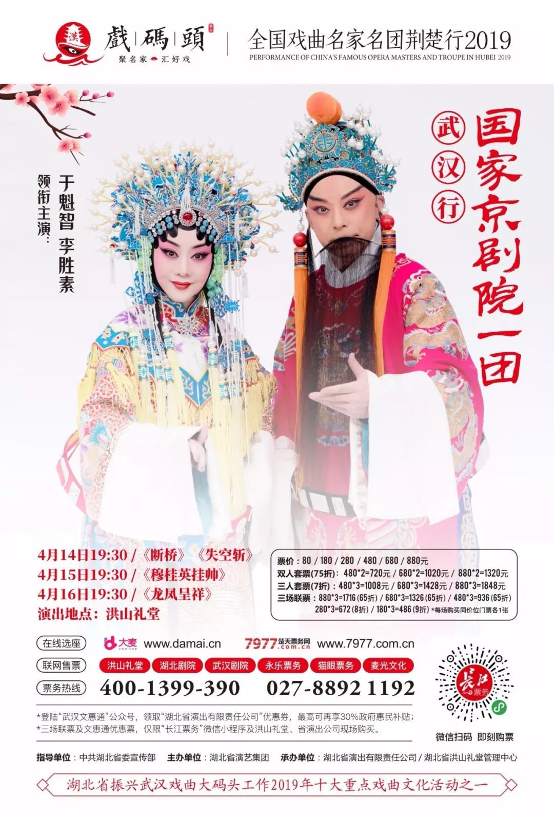 4月14日至16日,湖北省振興武漢戲曲大碼頭工作2019年十大重點戲曲文化項目之一,“戲碼頭——全國戲曲名家名團荊楚行”將在洪山禮堂帶來最頂級的京劇盛宴。“京劇第一老生”于魁智與“梅派青衣第一人”李勝素領銜國家京劇院,同臺演繹《斷橋》《失空斬》《穆桂英掛帥》《龍鳳呈祥》四出經典名劇。