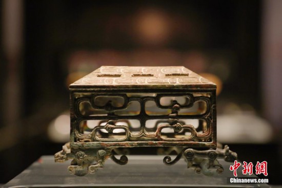4月3日,“清明祭初祖 文脈傳華夏”網絡主題采訪團走進陜西梁帶村芮國遺址博物館。梁帶村芮國遺址博物館于2018年2月14日正式對外開放。梁帶村芮國遺址位于陜西省韓城市西莊鎮,為西周、東周時期古芮國遺址,發現于2004年10月。圖為在芮國遺址博物館展出的鏤空方盒,博物館主體建筑風格就是對該文物進行提煉而設計。趙昊 攝