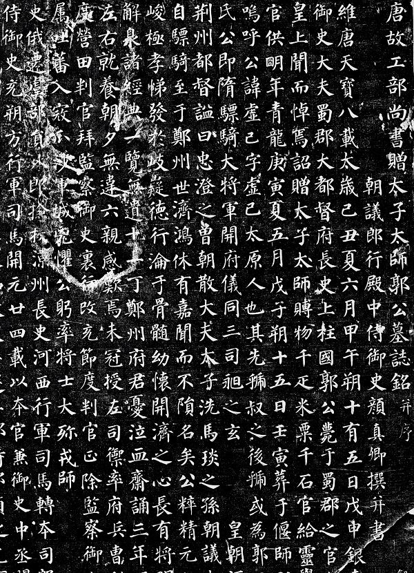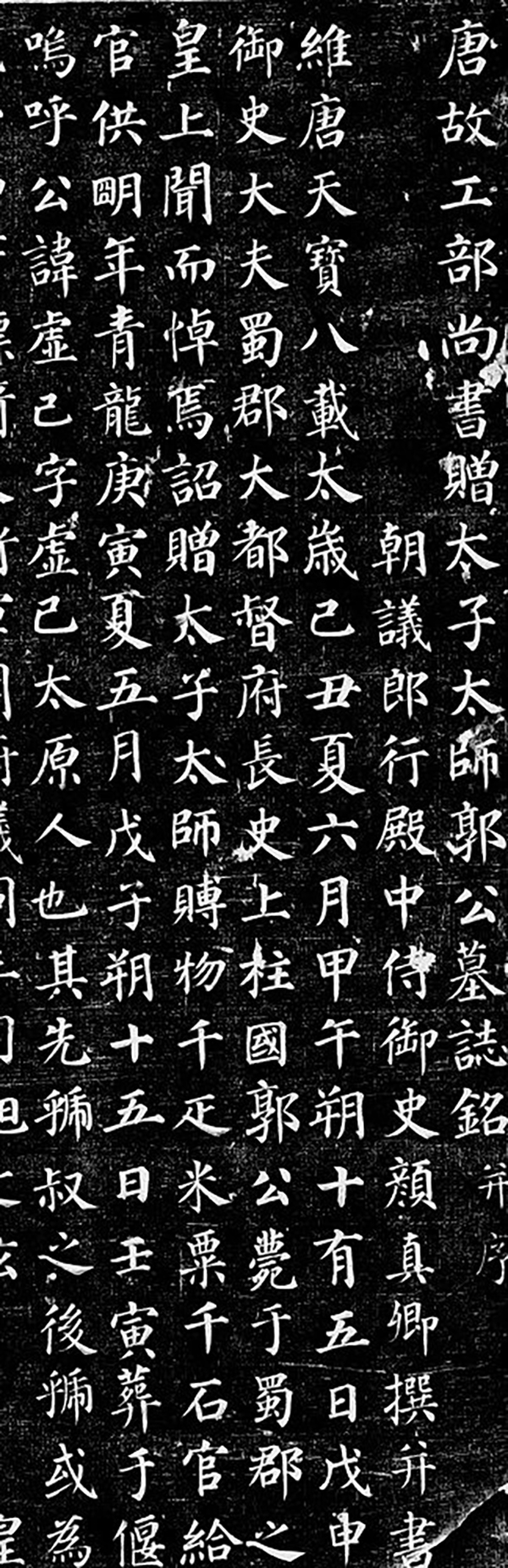 志主郭虛己,太原人。自幼聰明好學,一生宦海沉浮,官至工部尚書,晚年與吐蕃征戰多年,最終“薨于蜀郡之官舍”。天寶八載(749)六月十五日卒。顏真卿為唐代著名書法家,與趙孟頫、柳公權、歐陽詢并稱為“楷書四大家”。又與柳公權并稱“顏柳”,被稱為“顏筋柳骨”。此志書寫于顏真卿41歲時,比著名的《多寶塔碑》早3年,是他早期書法的代表作。用筆挺拔嚴謹,結體方平端莊,具有浩然正氣和勃勃生機。顏體楷書氣象雄渾、體勢寬博的主要特點在這幅作品中已透露出來。
