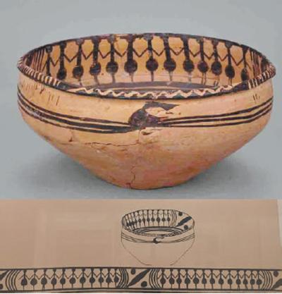 舞蹈紋彩陶盆是青海海南藏族自治州同德縣宗日遺址出土,屬于新石器時代的馬家窯類型,距今5000多年,是黃河上游最有代表性的文化。它高12.5厘米,口徑24.2厘米,腹徑24厘米,底徑9.9厘米。斂口,卷沿,小平底,黑彩紋飾,口沿處有成組的對頂三角紋和成組的斜線紋,外壁繪有三道平行弦紋,口沿內壁繪有兩組手拉手群舞的人體圖形,一組11人,一組13人,共24人,人物的頭部戴有寬大的頭飾,腰部以圓球形為裝束,人物之間以弧線紋、斜線紋、圓點紋相隔,人物的腳下飾有四條平行弦紋。整個畫面看似靜止,卻似乎能夠感覺到那種有節奏的舞動。一件小小的彩陶體現出了遠古觀察生活、表現生活的能力,也讓我們看到當時先民的審美能力。