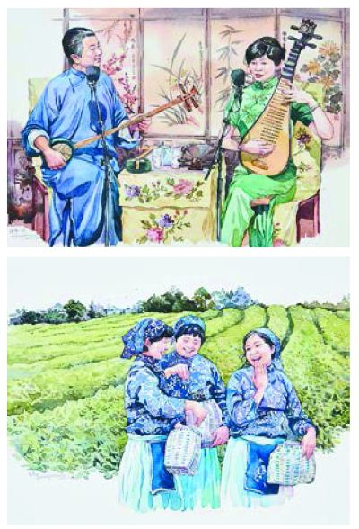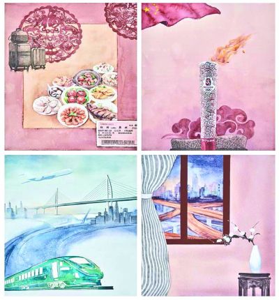 對于面貌一新的連環畫,有些觀眾在現場熱烈討論,這還是連環畫嗎?來自廣東番禺的齊先生是中年人,他認為隋靜的《我們的四十年》中一幅畫面交代的內容太過豐富,傳統的連環畫不是一幅畫講一個故事嗎?但也有不少觀眾喜歡這套作品小而巧的切入口,用生活中的瑣碎與平凡講述改革開放四十年間老百姓生活的變化,爸媽那代人結婚時的“老三樣”,童年時代的紙飛機、小人書,家中電器的現代化,工作生活的遷徙等等。隋靜說她在創作中大膽運用了設計的平面化語言,這也是本屆組委會倡導的開放包容的藝術特點。李旻的《印象中國》同樣呈現了豐富的設計語言,色彩清新,畫面靈動灑脫。陳皓的《三里橋碎影》筆墨輕松,人物塑造很有特點。李詩蕓《被解放的雙腳——百年中國交通工具演革史》,似乎用剪紙的形式完成了主要構圖,畫面很有立體感,這組作品既像綜合材料,又像小型裝置,式樣新穎,抓人眼球。薛春華的《青風藏音》色彩大膽奔放,熱烈鮮活,有不少觀眾在畫作前合影。