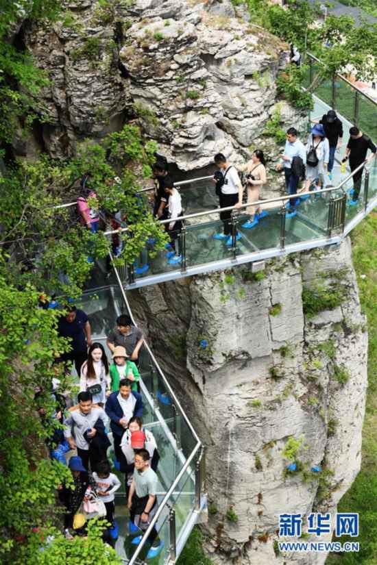 5月4日,游客在山東省棗莊市山亭區徐莊鎮葫蘆套村景區的環山玻璃棧道上游玩。新華社發(李宗憲 攝)