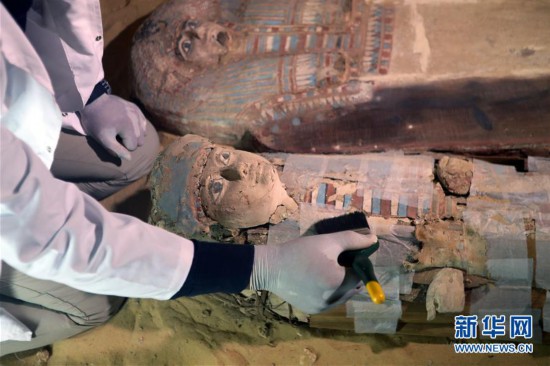 5月4日,在埃及吉薩,考古學家在墓穴內工作。 埃及最高文物委員會秘書長穆斯塔法·瓦齊里4日在一份聲明中說,埃及一支考古隊在吉薩高地大金字塔附近發掘出一處埃及古王國時期(公元前2686年至公元前2181年)的墓地。 新華社發(艾哈邁德·戈馬攝)