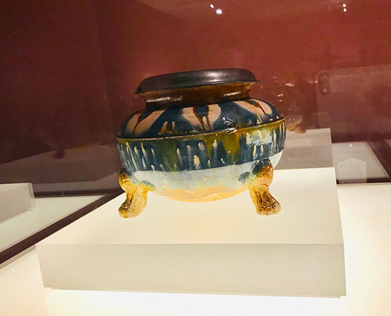 唐朝時曾有大批唐三彩流傳至當時的朝鮮半島,現在的韓國寺廟出土的大量唐三彩瓷器也證實了這點。例如,展區中的唐三彩三足罐是用于喪葬的骨灰罐。對于同處于絲綢之路東方的韓國、中國、日本來說,絲綢之路是幫助三國了解彼此文化傳統的核心概念,它們的歷史具有十分深遠的意義。(參考來源:中國國家博物館官網)