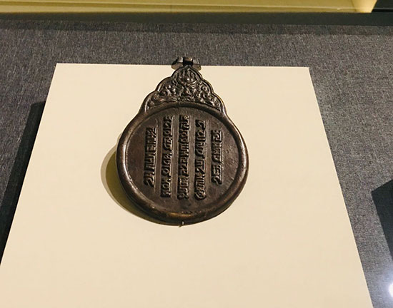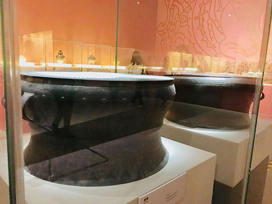 作為貿易伙伴,中國與柬埔寨的貿易往來十分頻繁。在展區中出現的銅鼓與中國云南、廣西、貴州等地區的非常相似,它在整個東南亞區域都有流傳。這種銅器原是一種打擊樂器,后來成為一種貴重的用于祭祀的禮器。銅鼓沒有文字,只有裝飾花紋,太陽紋是最普遍的鼓面中心紋飾,鼓面周邊多有立體的青蛙浮雕。