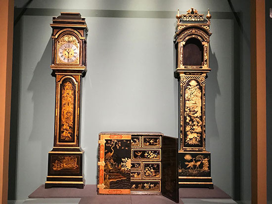 波蘭國家博物館館藏的長殼鐘和黃銅鑲嵌的木質柜子,極具中國風。