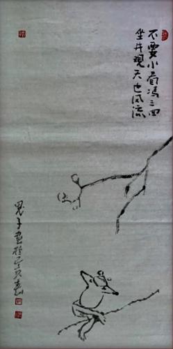 鬼子也覺得四月有意思,前幾天,他就給馮三四畫了一幅畫:一根含苞待放的花枝下面,一只怡然自得的青蛙仰天而臥,憨態可掬。畫中題字“不要小看馮三四,坐井觀天也風流”。