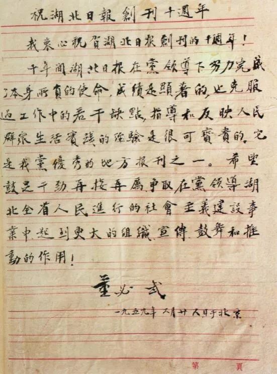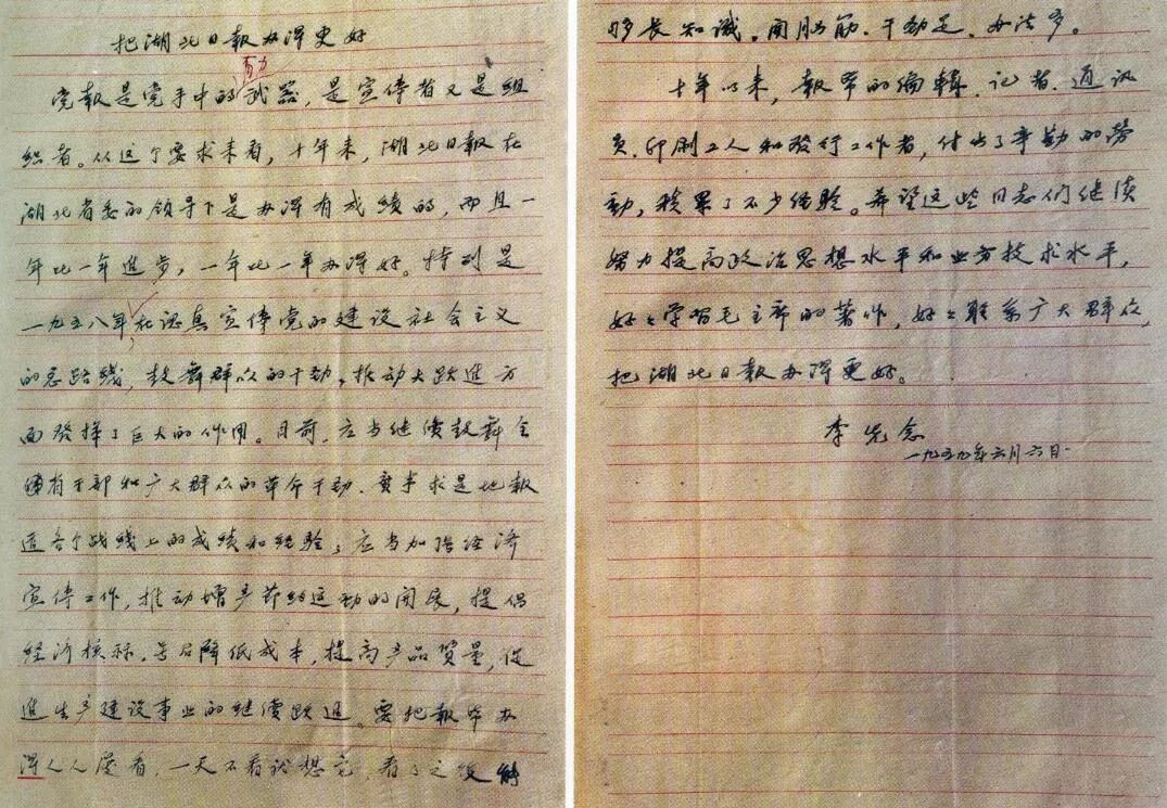 1959年,國家副主席董必武和國務(wù)院副總理李先念分別為《湖北日報》創(chuàng)刊十周年題字。