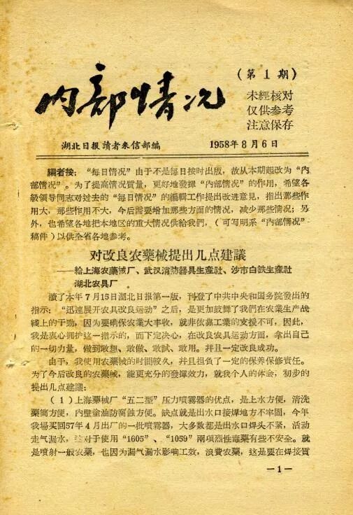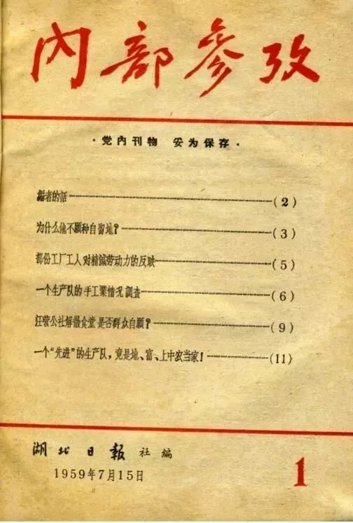 根據(jù)省委指示,1959年7月15日,湖北日報社主辦的《內(nèi)部參考》創(chuàng)刊,16開本,周刊。