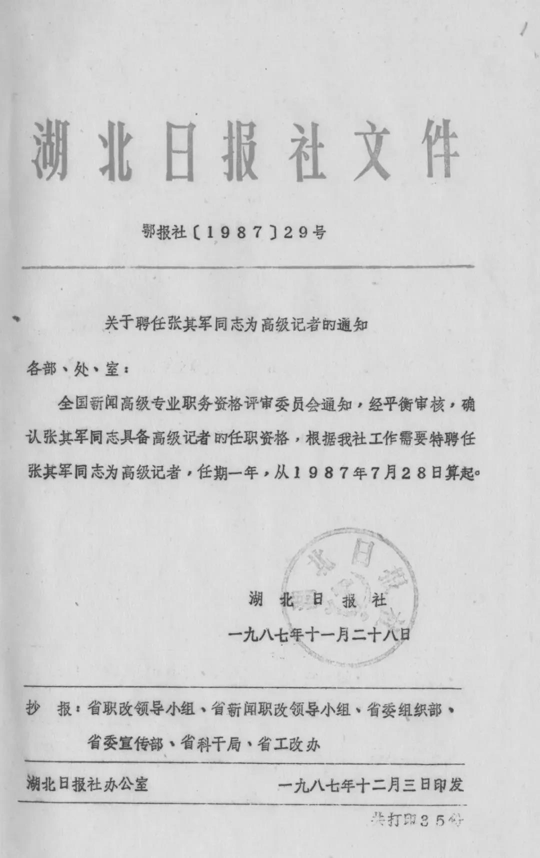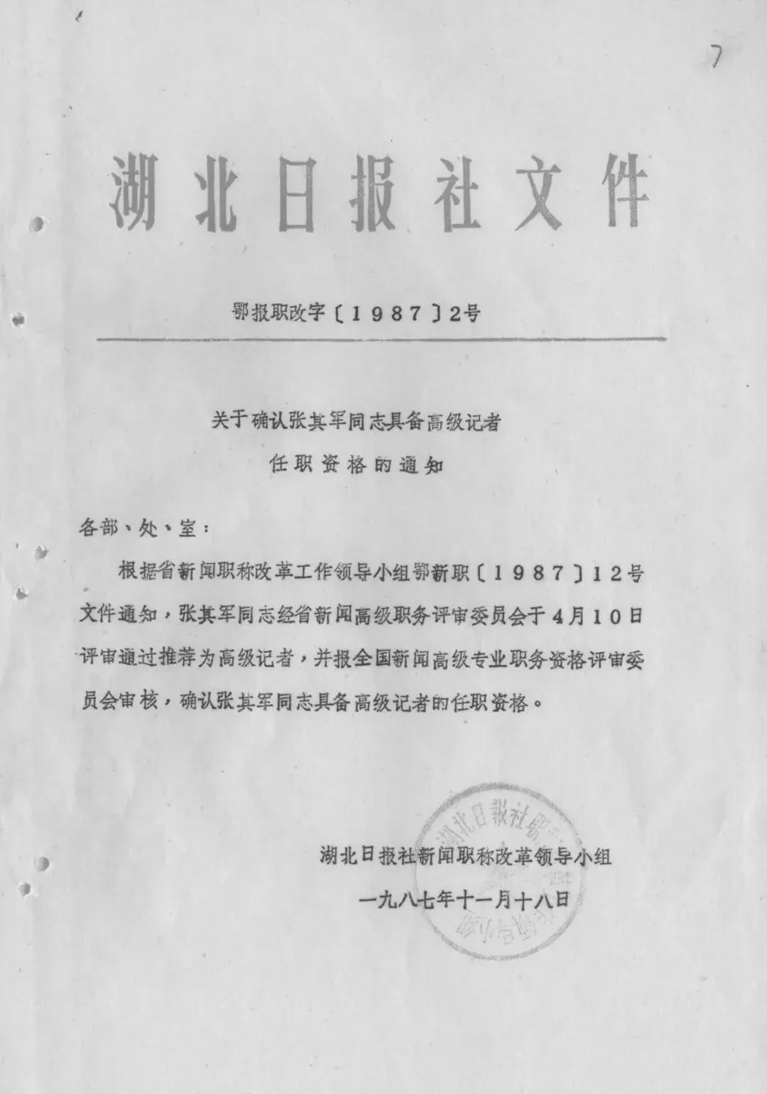 關(guān)于聘任張其軍同志為高級記者的通知。