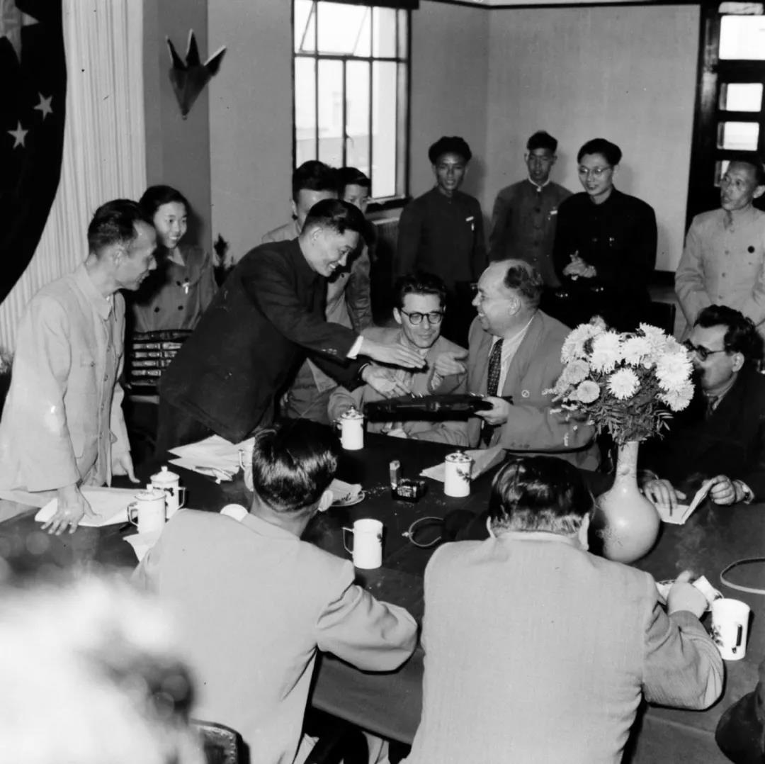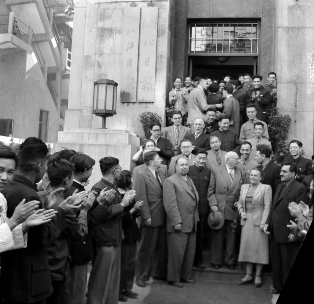 1954年11月1日,蘇聯(lián)報刊工作代表團訪問湖北日報,在報社辦公大樓(紅旗大樓,江漢路52號)前受到報社職工的熱烈歡迎。