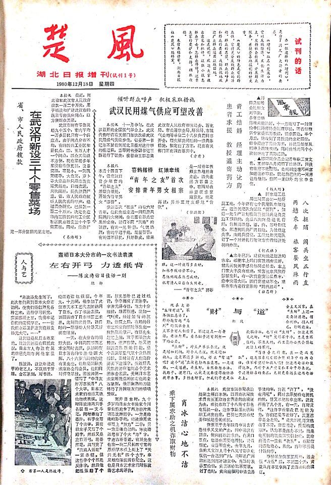 1980年12月8日,《湖北日報》以“增刊”名義創(chuàng)辦《楚風(fēng)》,四開四版,逢周日出版,自辦發(fā)行。《楚風(fēng)》銷量最高時達20萬份。1981年12月27日停刊。