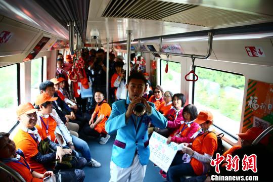 在車廂里,大連市青年民間藝術家吹響嗩吶,博得陣陣掌聲。 蘇航 攝
