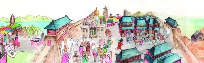 叢書通過百科知識的交相輝映來厚植愛國主義情懷。愛國主義既形象又抽象,既表現為言行又根植于內心,既源于感性更需要理性。為此,要在兒童中厚植愛國主義情懷,就需要圍繞“有什么”“是什么”“為什么”“怎么樣”的思路,從形象圖案遷移至抽象文本、從感性認知升華到理性思索、從現實觀照回歸至多元場景,唯有把其建立在深厚的民族文化和豐富的日常生活基礎之上,才能使愛國主義情懷熱烈濃郁、厚重深沉、經久不衰。國家地理版圖給廣大兒童打開了美麗中國的一扇扇窗戶,他們從一幅幅長卷繪本中感受到了黃河的奔騰、海岸的漫長、大山的偉岸、長城的古老和絲路的滄桑,而在這些具有重要政治意義、地理意義和社會意義的標識線上,又為我們勾畫出一連串的地理印記,并通過多學科解讀,為兒童了解當下中國提供了重要腳本。在這些解讀中,既有發展狀況的現實展示,也有歷史變遷的追根溯源;既有科學知識的初步啟蒙,也有生態文明的現實呼喚;既有詩詞歌賦的大氣婉約,也有絲路駝鈴的陣陣悠揚。總之,它把歷史、自然、生物、建筑、宗教、文學、藝術、交通等諸多學科融入地理繪本之中,從而實現了百科知識的交相輝映,既可作為兒童成長的啟蒙讀物,又是厚植愛國主義情懷的重要載體。