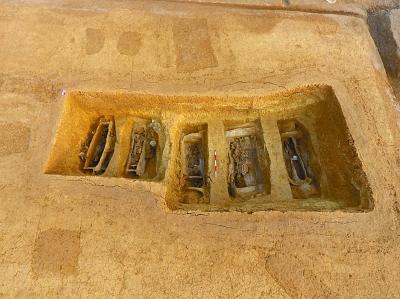 類似于這樣的大型墓葬還有5座,面積都在10平方米以上,分布于墓地的不同位置,并且都是同穴雙室合葬墓,墓室內常見體量巨大的棺木和豐厚的隨葬品。通過對保存下來的人骨鑒定可知,這些大型墓葬的主人都是頭朝城內,表現出了對生活場所的眷顧。在它們的周邊,則分布有數量不等的中小型墓葬,頭向不盡相同。不過,也似乎存在部分墓葬圍繞大型墓葬分布的現象。它們之間的準確關系有待于古DNA信息的最終解讀。