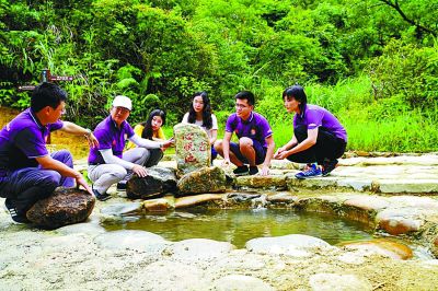 香山古驛道上有口古井,古時在古井泉邊會放有兩個茶杯,路過的行人用茶杯舀水來喝。由于古井長久不用,加上小動物的破壞,井邊雜草叢生,古井已趨于荒廢。仲夏時節,在專業志愿者龐偉的帶領下,志愿者們正用碎石粒對水池底部的施工痕跡進行美化遮擋。高溫下的連續工作使每位志愿者都汗流浹背。整治后的曲水流泉將溪水與石步道融合成為一體,山路幽寂、泉水清涼,重現了昔日古道的優美身姿。自2014年9月以來,由建筑師、規劃師、工程師組成的“三師”專業志愿者隊伍以多種形式參與古驛道保護工作,成為南粵古驛道助力廣東實施鄉村振興戰略又一務實舉措。