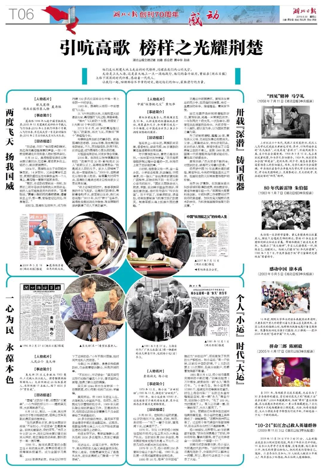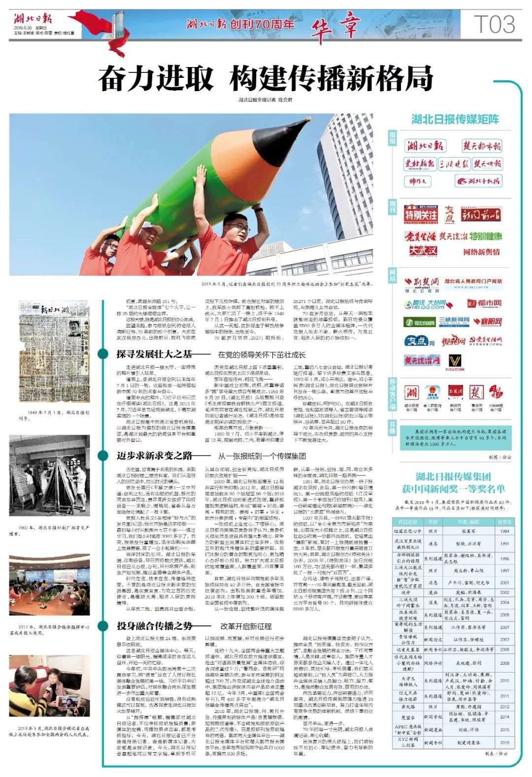 馬學(xué)禮、朱伯儒、夏菊花、潘星蘭、吳天祥、陳剛毅、劉芳艷、譚紀(jì)雄、沈因洛、張富清……這些名字如璀璨群星,閃耀楚天;襄樊棉紡廠的勤儉創(chuàng)業(yè),楊小運(yùn)超賣萬(wàn)斤糧,官橋八組的農(nóng)村新貌……奮斗如歌,生活蝶變?nèi)绠?huà)?!昂比?qǐng)?bào)”這四個(gè)字,標(biāo)示著我們的身份和角色,也標(biāo)示著我們所站立的地方、服務(wù)的對(duì)象。70年來(lái),湖北日?qǐng)?bào)深情記錄著荊楚人民迸發(fā)出來(lái)的創(chuàng)造力量,傾聽(tīng)著荊楚人民的所思、所想、所盼,捕捉著荊楚人民不斷增強(qiáng)的獲得感、幸福感、安全感。一代代湖北日?qǐng)?bào)人在一塊塊版面、一篇篇文字、一個(gè)個(gè)影像中,注入的情懷、開(kāi)展的互動(dòng),讓我們這份報(bào)紙和閱讀它的人們之間,不只是創(chuàng)作者與讀者的關(guān)系,更是無(wú)言的約定,默契的陪伴,指向永遠(yuǎn)。