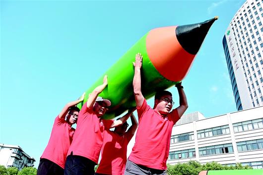 圖為:2019年5月,記者們在湖北日報創(chuàng)刊70周年職工趣味運動會上參加“妙筆生花”比賽。