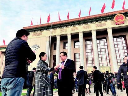 圖為:2018年全國兩會上,湖北日報全媒記者黃璐(左二)、周浩峰(左一)現場直播采訪全國人大代表蔡學恩。