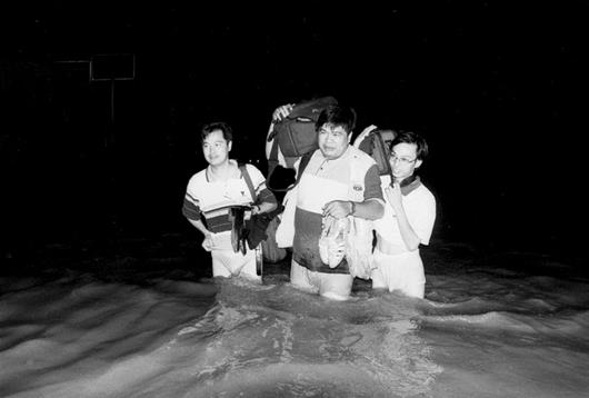 圖為:1998年在公安縣埠河碼頭,湖北日報記者劉長松(左)、楊發維(中)、孔祥福(右)扛著器材摸黑蹚水過河采訪防汛。