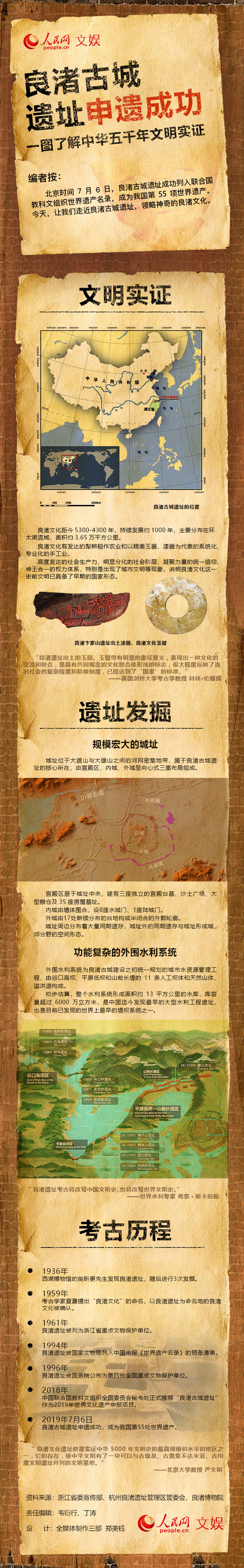 人民網北京7月6日電 (韋衍行)7月6日,在阿塞拜疆首都巴庫舉行的聯合國教科文組織第43屆世界遺產委員會會議通過決議,將中國世界文化遺產提名項目“良渚古城遺址”列入《世界遺產名錄》。至此,我國世界遺產總數達到55處。