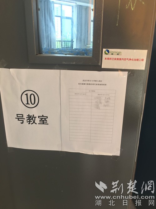 記者發現,在每個教室的后門,幾乎都貼有《武漢市育才小學樹人校區室內裝修污染治理代表現場簽到表》,上面有數位家長簽名。