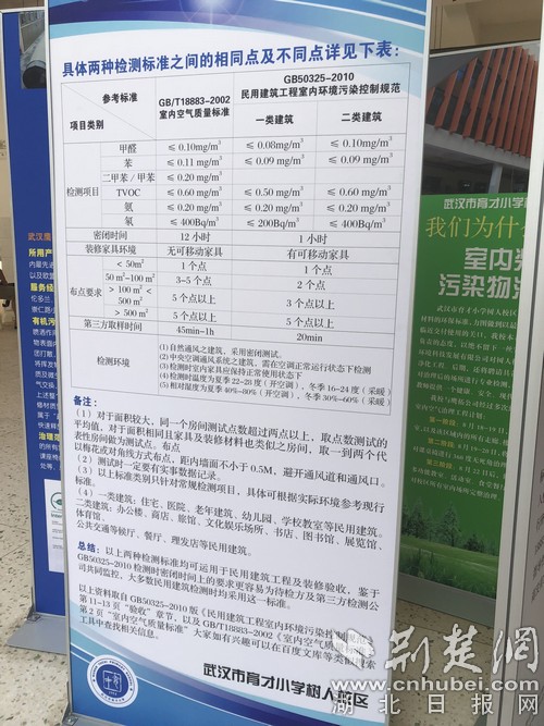 教育條件處介紹,他們嚴格執行《民用建筑工程室內環境污染控制規范》,委托有資質的檢測機構對學校新擴改建項目和裝飾維修工程進行室內環境污染物濃度檢測,不合格立即進行環保處置,不達標的校舍一律不投入使用,確保校園室內空氣質量達到規范標準,各校還將檢測結果予以公示,主動接受各方監督。江夏區、黃陂區今年新建交付共有12所學校,已于上周全部檢測合格,并公示了檢測報告。對于被投訴的藏龍二小,教學主體在5月份就完工了,上周才完成空氣質量檢測。而育才小學樹人校區,也已達到標準。