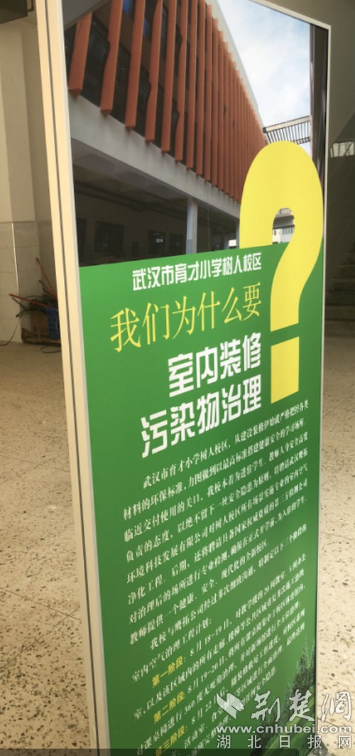 上午11點,記者又來到育才小學樹人校區,這是育才小學的新校區,門口正停著一輛吊車作業,地下車庫處于封閉狀態,工人正忙著鋪草坪、種綠植。《我們為什么要室內裝修污染物治理》的展牌,被放置在顯眼處。