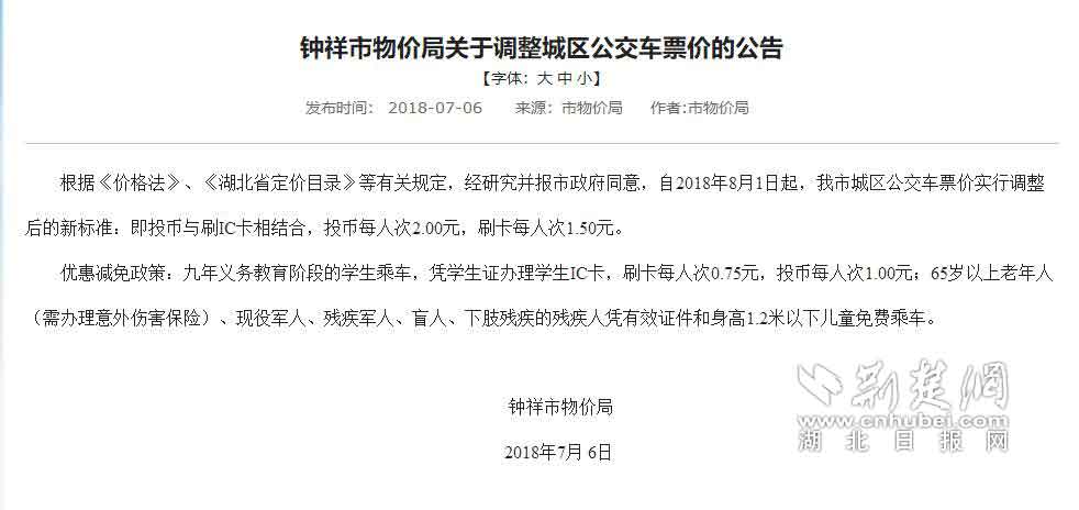 記者在鐘祥市人民政府的官網上看到,8月1日起,鐘祥市城區公交車票價實行調整后的新標準:即投幣與刷IC卡相結合,投幣每人次2.00元,刷卡每人次1.50元。其中九年義務教育階段的學生乘車,憑學生證辦理學生IC卡,刷卡每人次0.75元,投幣每人次1.00元。