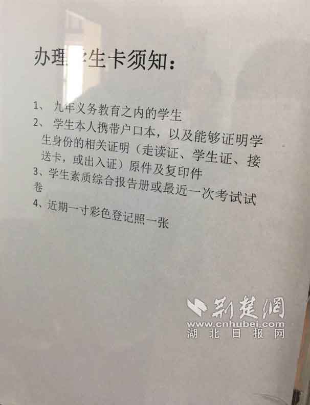 今日上午,荊楚網“網絡問政—民生熱線”一則問政引起眾人關注。荊門鐘祥市網友發帖留言:“看看你們干的事!不要忘了你的定位!服務人民!”他貼出一張名為《辦理學生卡須知》的照片,照片中的文字為:1、九年義務教育之內的學生;2、學生本人攜帶戶口本,以及能夠證明學生身份的相關證明(走讀證、學生證、接送卡,或出入證)原件及復印件。3、學生素質綜合報告冊或最近一次考試試卷;4、近期一寸彩色登記照一張。
