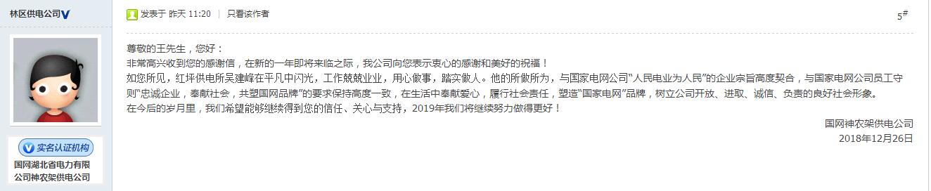 國網(wǎng)湖北省電力有限公司神農(nóng)架供電公司在感謝信下回復(fù):尊敬的王先生,您好!非常高興收到您的感謝信,在新的一年即將來臨之際,我公司向您表示衷心的感謝和美好的祝福!如您所見,紅坪供電所吳建峰在平凡中閃光,工作兢兢業(yè)業(yè),用心做事,踏實(shí)做人。他的所做所為,與國家電網(wǎng)公司“人民電業(yè)為人民”的企業(yè)宗旨高度契合,與國家電網(wǎng)公司員工守則“忠誠企業(yè),奉獻(xiàn)社會,共塑國網(wǎng)品牌”的要求保持高度一致,在生活中奉獻(xiàn)愛心,履行社會責(zé)任,塑造“國家電網(wǎng)”品牌,樹立公司開放、進(jìn)取、誠信、負(fù)責(zé)的良好社會形象。在今后的歲月里,我們希望能夠繼續(xù)得到您的信任、關(guān)心與支持,2019年我們將繼續(xù)努力做得更好!