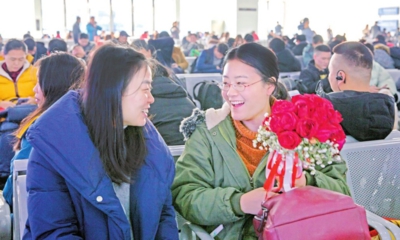 兩位天門旅客在孝感東站高興候車,準備回家。(記者石玲 攝)