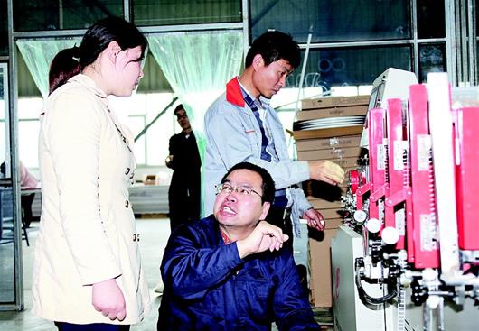 圖為:在湖北雄華玻璃科技有限公司車間,武漢科技大學(xué)副教授羅志安給工人講解新設(shè)備的使用方法。羅志安是湖北省第六批“博士服務(wù)團(tuán)”成員之一,2018年到應(yīng)城市雄華公司開展為期一年的掛職服務(wù)。 (視界網(wǎng) 匡文杰 劉振宇 攝)