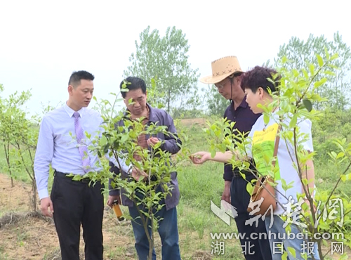 王俊(左一)向應城市總工會工作人員介紹油茶的相關情況。照片通訊員提供。