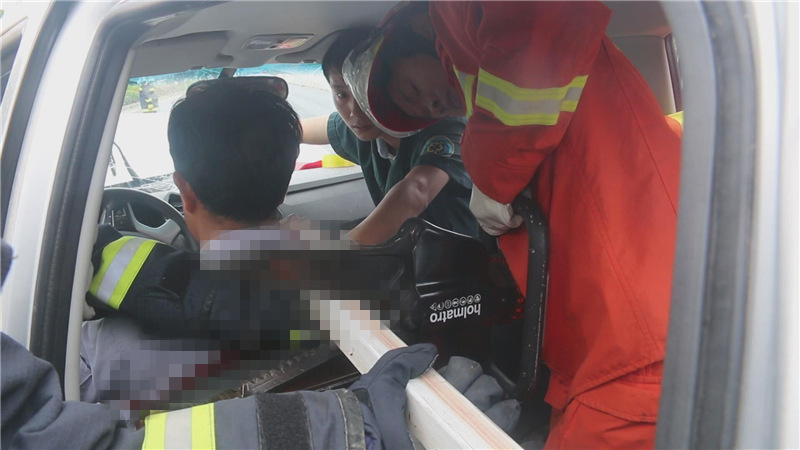救援人員到達現(xiàn)場后發(fā)現(xiàn),事故現(xiàn)場一片狼藉,失控車輛為一輛皮卡車,車頭因受到猛烈撞擊已嚴重變形,主駕駛座位上一男子右肩被護欄穿透,無法動彈,隨時都有生命危險。由于穿透駕駛員右肩的護欄過長,身體根本無法移動,為防止操作過程中對傷者造成二次傷害,消防人員和醫(yī)護人員商議后決定現(xiàn)將護欄剪斷,后送往醫(yī)院進行進一步救援。