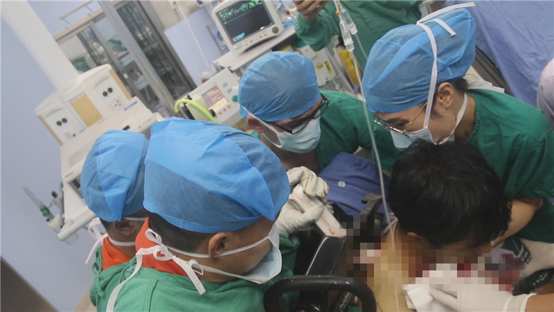 在孝感市中心醫(yī)院手術(shù)室,由于穿透駕駛員右肩的護欄長達60公分,給手術(shù)帶來極大不便,隨行趕來的消防員在手術(shù)室內(nèi)使用剪擴鉗對伸出體外的護欄進行切割。切割完成后,醫(yī)護人員立即進行手術(shù)。經(jīng)過兩個小時的緊張搶救,該男子脫離生命危險。目前,該男子生命體征平穩(wěn),被送入ICU繼續(xù)觀察。