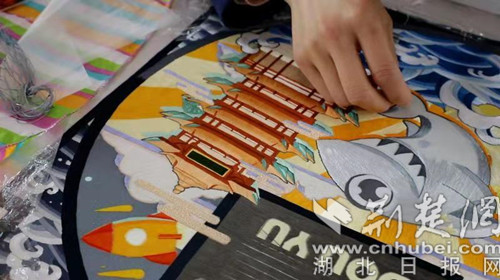 該作品是由大悟縣楚韻漢繡合作社兩名繡娘采用了打籽、盤金、纏針、套針、接針等二十余種技法,用時兩個半月精心繡制而成。這幅作品的絲線細如蠶絲,繡出的小鯊魚活潑靈動、浪花波濤洶涌、黃鶴樓巍峨壯觀,整幅作品完美展現了斗魚搏擊互聯網,勇于創新的時代精神和傳播荊楚文化傳承漢繡匠心的發展理念。