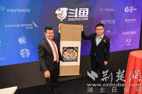 荊楚網客戶端—荊楚網消息(記者左硯文 通訊員 曾彩霞 李楊)7月17日,一幅漢繡作品作為禮物,從湖北斗魚CEO陳少杰手里轉交給美國納斯達克負責人,實現了漢繡作品在納斯達克的亮相。