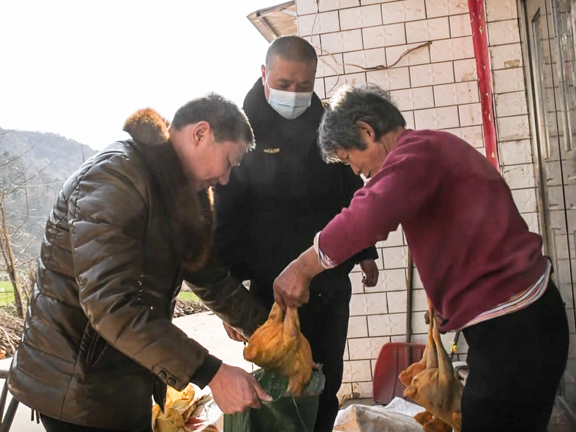 冬日的暖陽下,劉俊來到脫貧戶周以章家中,仔細詢問他的身體健康情況后,將事先訂購的15只雞款交到他的手中。