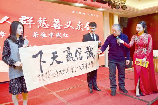 1月5日,在慈善義賣活動現場, 孝感知名書法家在介紹書法作品。當日,孝感市慈善總會、市工商業聯合會、市殘疾人聯合會、孝感紅貢茶有限公司聯合舉行慈善義賣會活動。11件書法、茶葉公益品亮相,義賣所得84020元善款捐贈給孝感市慈善總會,用于幫扶貧困人群。(實習生孟暢 攝)