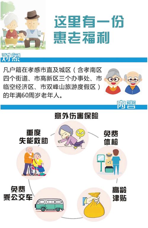 為營(yíng)造有利于老年人健康生活的社會(huì)環(huán)境,孝感市全面落實(shí)多項(xiàng)關(guān)愛惠老政策,符合條件的老年人可享受意外傷害保險(xiǎn)、重度失能救助、免費(fèi)體檢、免費(fèi)乘坐公交車、高齡津貼等。