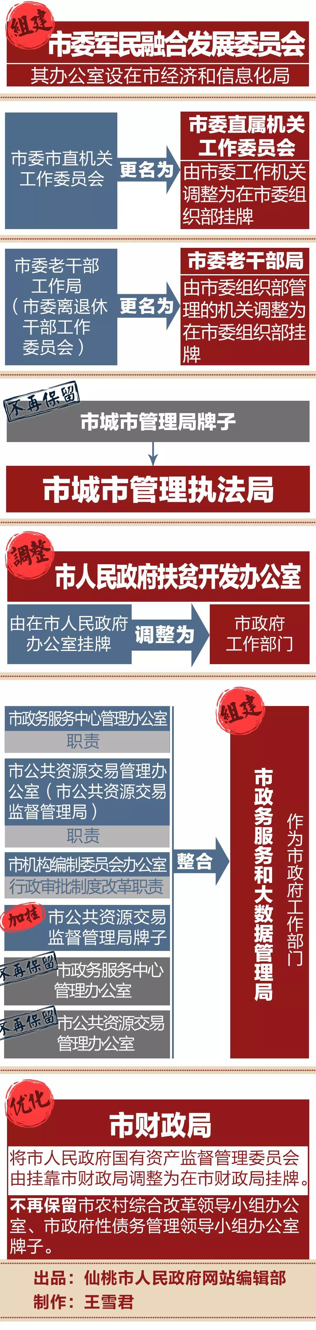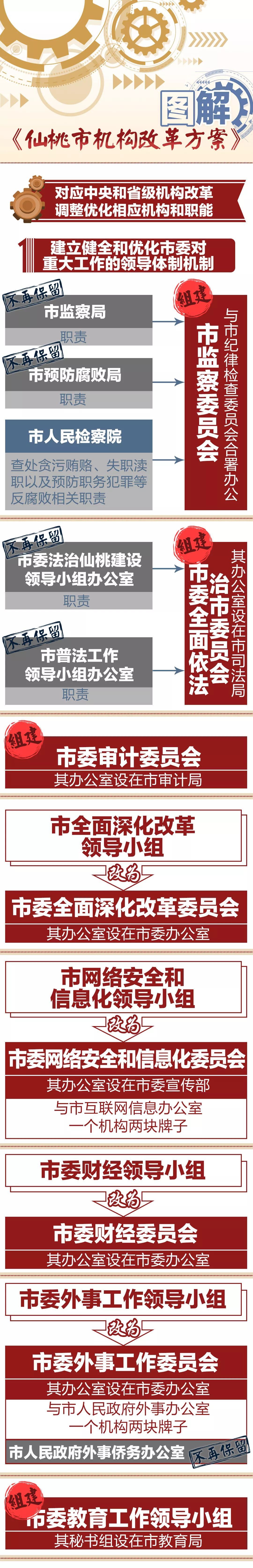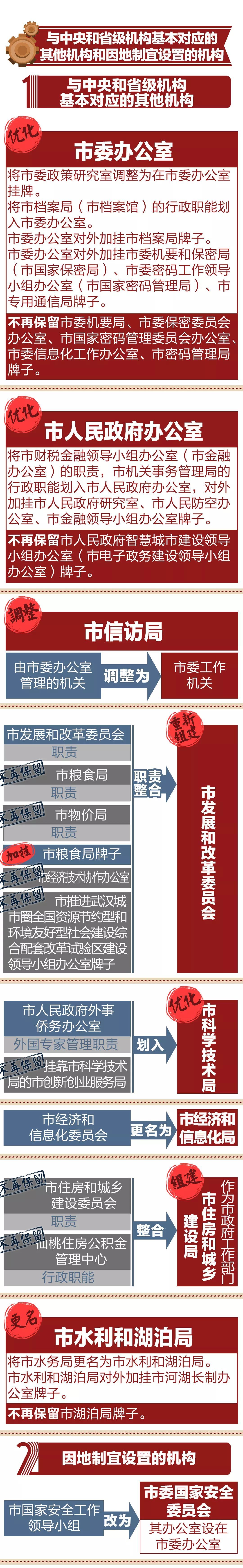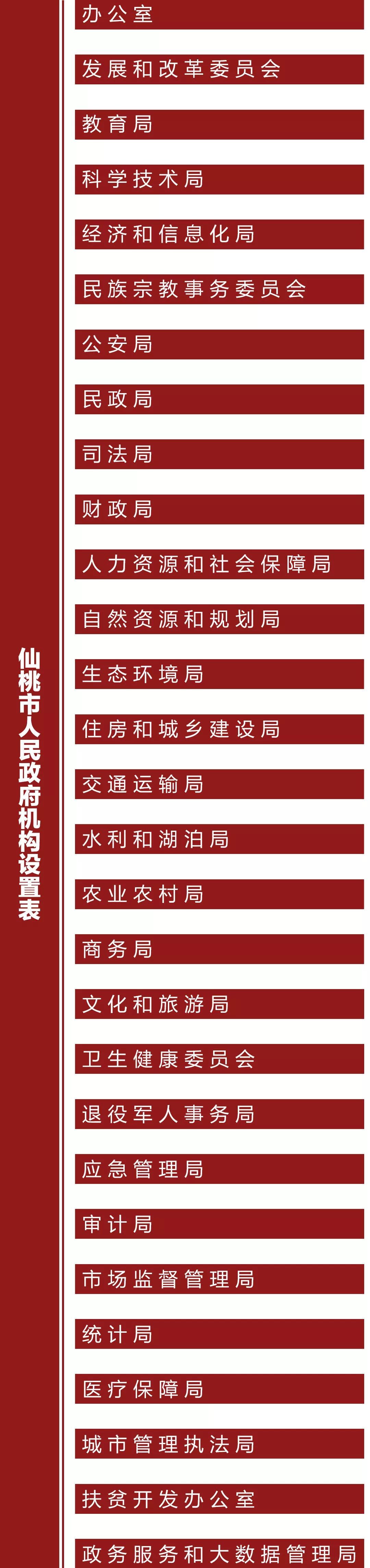 日前,省委省政府批復了《仙桃市機構改革方案》。本輪機構改革后,仙桃市共設置黨政機構37個:市委機構9個,其中,紀檢監察機關1個,其他計入機構限額的工作機關8個(設在相關部門的市委議事協調機構的辦事機構不計入機構個數)。市政府工作部門28個。