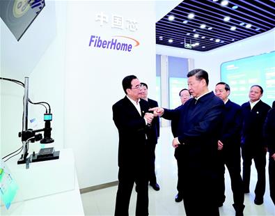 圖為:4月26日上午,習近平在位于東湖高新區(qū)的烽火科技集團考察企業(yè)創(chuàng)新發(fā)展情況。 (新華社發(fā))