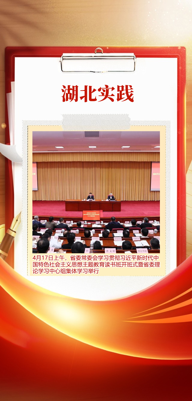湖北省積極開展學習貫徹習近平新時代中國特色社會主義思想主題教育,一場面向新征程的思想淬煉、政治歷練、實踐鍛煉、專業訓練在荊楚大地上迅速鋪開。省委堅決扛起政治責任,緊扣“學思想、強黨性、重實踐、建新功”總要求,省委主題教育領導小組精心組織、周密部署,既對標對表中央、高標準高質量做好“規定動作”,又立足湖北實際、特色鮮明做出“自選動作”,一體推進理論學習、調查研究、推動發展、檢視整改四項重點措施,確保主題教育取得實效。