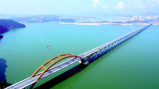 圖為:一庫清水環繞,讓十堰從山城變成山水之城。圖為該市鄖陽漢江大橋。(湖北日報全媒記者 陳勇 攝)