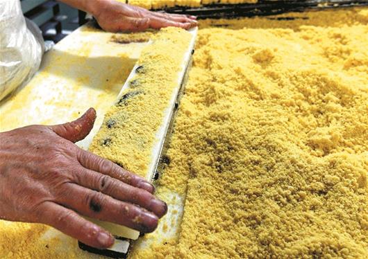實(shí)際上,曹祥泰做綠豆糕前期還有很多消費(fèi)者看不到的功夫,如每年9月把新鮮產(chǎn)出的綠豆煮到七八成熟,晾曬存放,待到第二年端午節(jié)前將綠豆去皮、打粉。