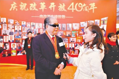 “我看不見,但聽得很激動。”戴著一副黑色墨鏡,胸前掛著改革先鋒金色榮譽獎章。鄭舉選雖有些疲倦,但情緒高昂,笑容滿面。他告訴記者,在大會上,聽到自己被授予改革先鋒的稱號時,內心很高興也很慚愧。“總覺得自己做得還不夠,需要繼續努力。”