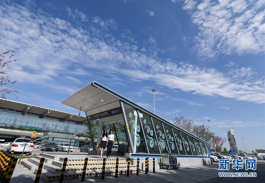 兩名乘客從成都地鐵10號線雙流機場T1航站樓站走出(2017年9月6日攝)。新華社記者 江宏景 攝